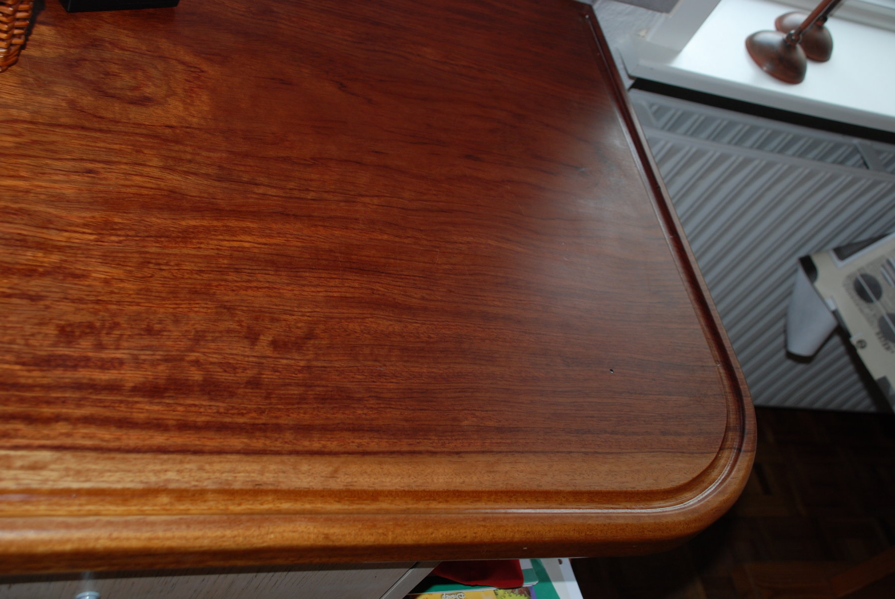 Her ses et resultat af en køkken bordplade af massiv træ, hvor der er lavet en fedtrille.