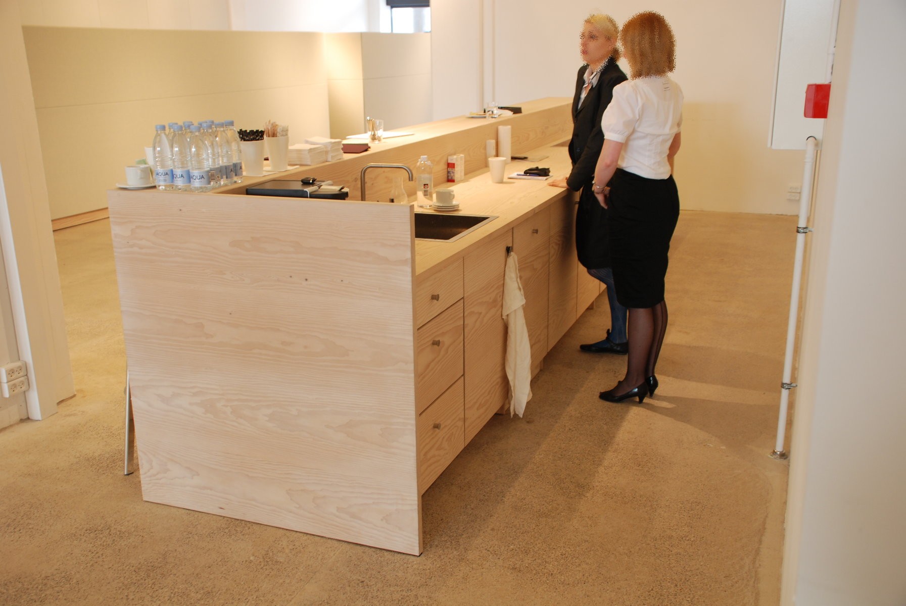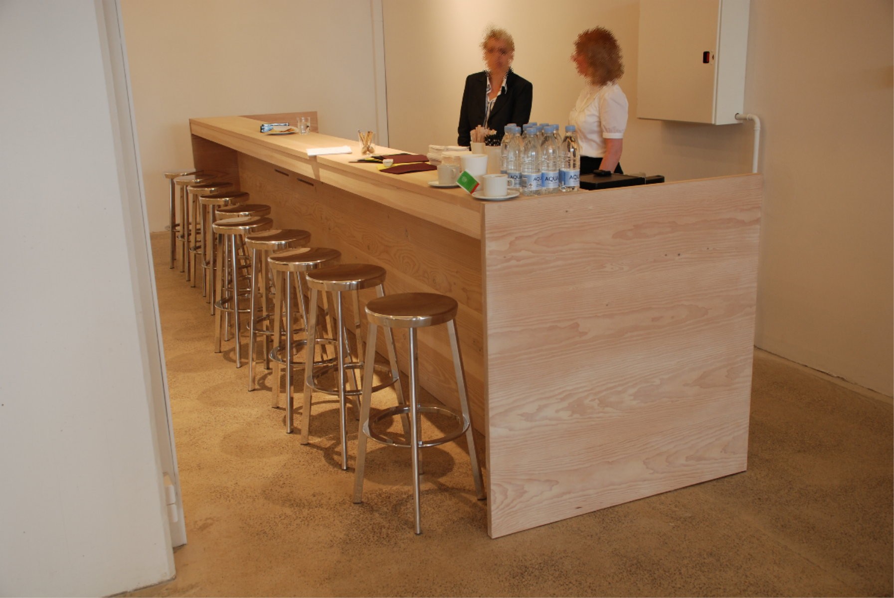 Se her et eksempel fra Kvadrat A/S, hvor skranken er fremstillet i massiv sæbebehandlet daugeles. Bemærk facaden, hvor træets årer er gennemgående på hele siden. Rigtig flot detalje.