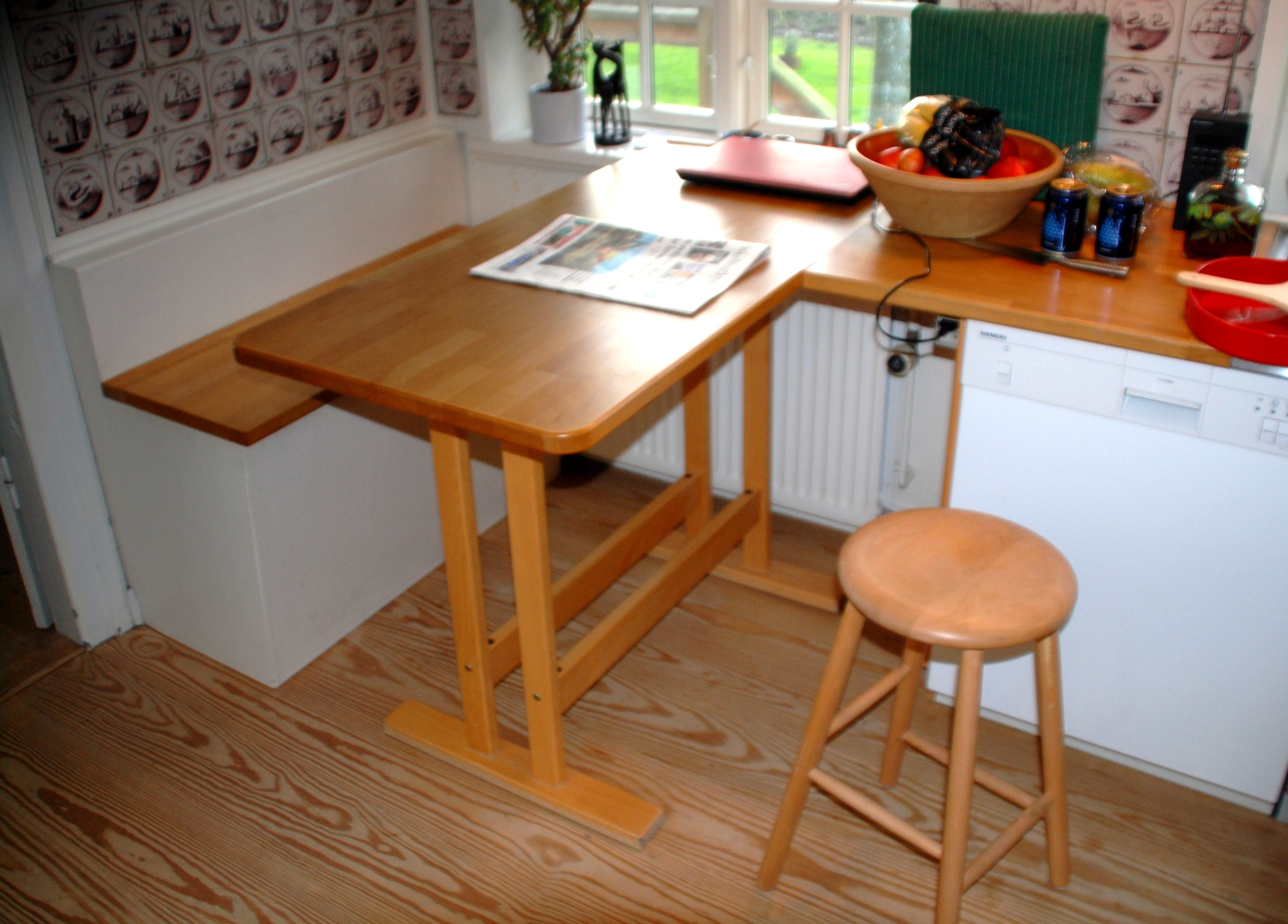Her ses en løsning på, hvordan man kan udnytte en bordhøjde på 90 cm. og samtidig få en hyggekrog og større bordplads i køkkenet. Kistebænken er lavet 20 cm. højere, og så er der monteret en sarg på bordet til at hvile fødderne på. Læg mærke til det fine gulv i pitch pine, som vi også har lagt.