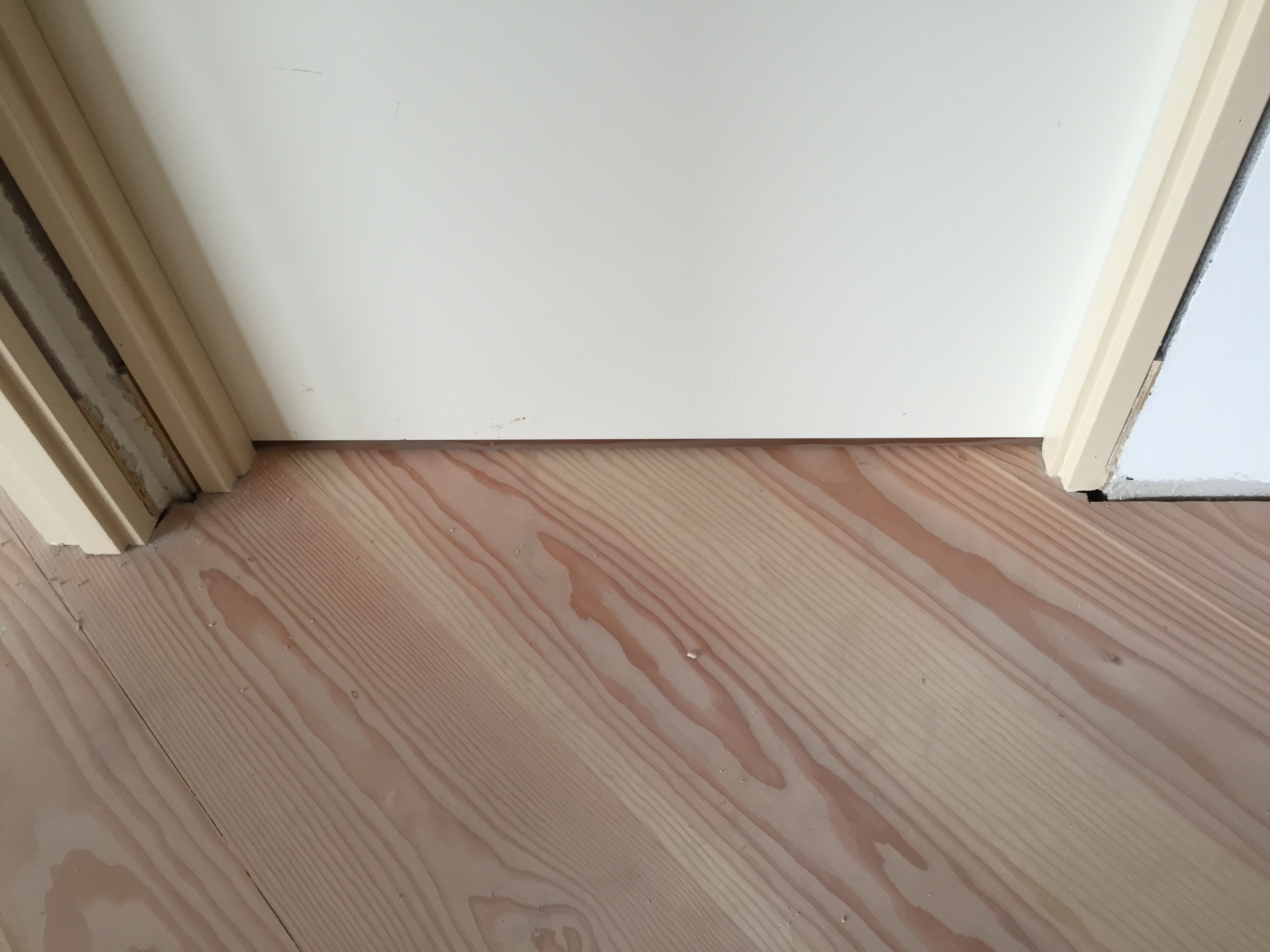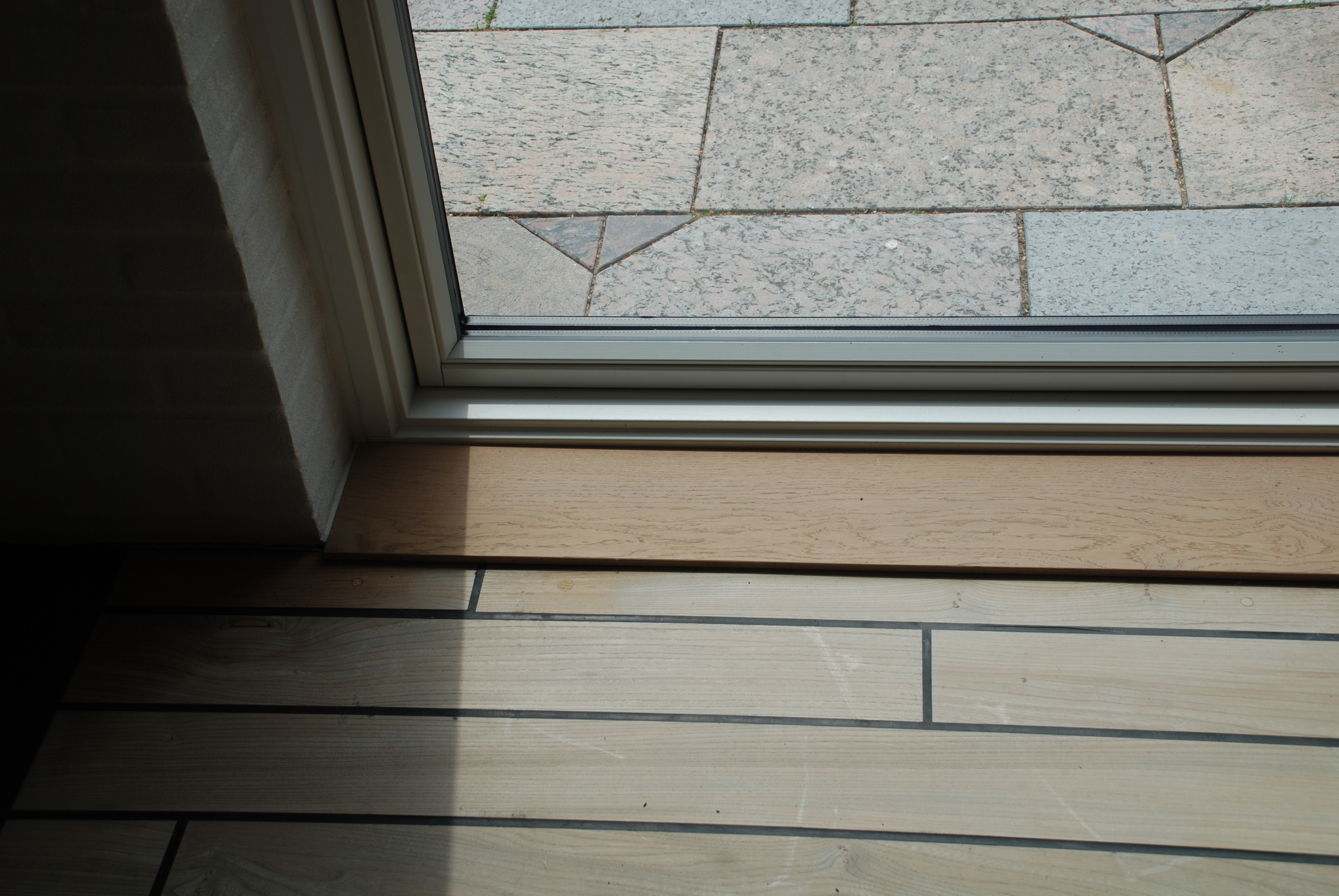 Her ses et eksempel på, hvorledes man kan montere en dør, hvor bundpladen skal støde ind til et svømmende gulv. Ege pladen er lavet så gulvet frit kan vandre inde under pladen.